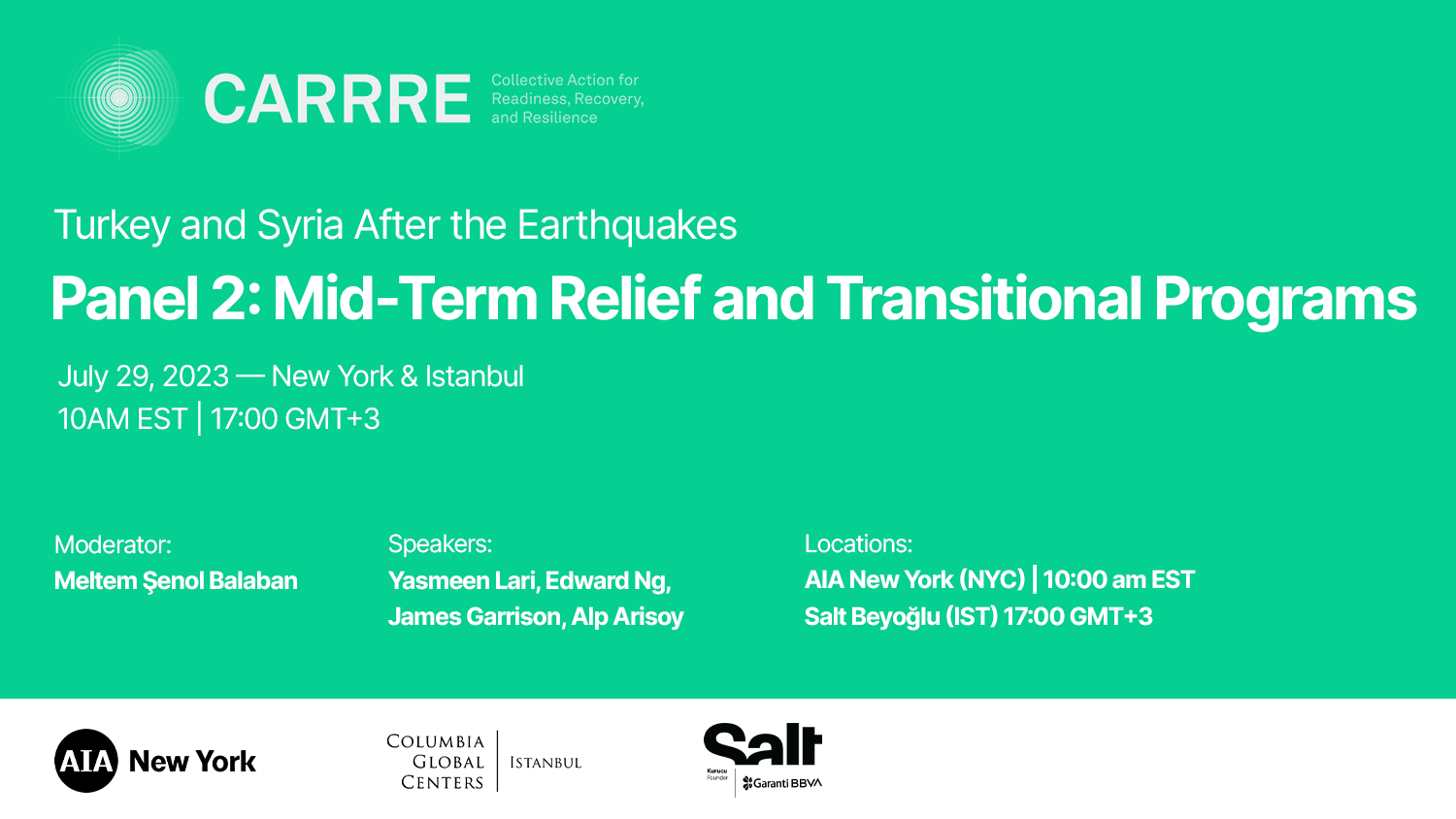 Mimar, mühendis, akademisyen ve şehir planlama uzmanlarının kolektif çabasıyla kurulan New York ve İstanbul bazlı girişim CARRRE (Collective Action for Readiness, Recovery, and Resilience), AIA New York ve Salt'ın ortaklaşa düzenleyip birlikte ev sahipliğini yaptığı ilk panel serisiyle açılışını duyurdu.