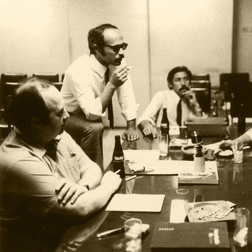 1967’ye ait bir fotoğraf. Sinematek’te çekilmiş. O zamanki büro Mis Sokak’taydı. Aşağıda Mis Hamamı, yukarıda Sinematek’in büroları vardı. Sinemanın kendisi ise Kervan Sineması idi. Şişli Camii’nin arkasında Bomonti’ye, Okmeydanı’na doğru bir yerdi. Uzaklığına rağmen herkes gidiyordu oraya. İstanbul’da sefer daha kolaydı. Daha az insan ve daha az araba vardı. Bugün düşünülse, yönetici ekip “kimse gelmez oraya” der. Sıraselviler’deki sinema ‘70’in kasımında açıldı. Bu fotoğrafta karşımızda kimler var, hatırlamıyorum, ama herkesin elinde kalem kâğıt, notlar tutuluyor. Şakir (Eczacıbaşı) Bey orada değildi. O çok az gelirdi. Gündüz görmek mümkün değildi. Ve gördüğümüz gibi önümüzde Uludağ maden suyu şişeleri var. Neyin toplantısı olduğunu hatırlamıyorum. Bu fotoğrafı bana Hüseyin ölmeden üç-dört ay önce verdi. Bana bir fotoğraf vereceğini söylemişti, “tabii, memnun olurum” falan demiştim. Fotoğrafın ne olduğunu bilmediğimden üstünde durmamıştım. Ölmeden önce evine ziyarete gittim, Teşvikiye’de idi. O ziyaretimde verdi bana fotoğrafı. Zarf içinde hazırlamış, büyütmüş, “sende kalsın” dedi. Tabii ağır hastaydı. “Onat zaten gitti, ben de gidiyorum” der gibiydi, “bizim en gencimiz sensin” diyordu bana. Sanki bana öyle geldi. Atletizm yarışlarında bayrağı vermek gibiydi. Bu resim o resim. Maalesef Sinematek’le ilgili olarak o dönemden elimizde çok az belge var. O zaman fotoğraf makinesi çok azdı. Pahalıydı. Pelikülü yıkatmak da bütçe gerektiriyordu. Profesyoneller, Ara Güler’ler falan hep resim çekiyordu, ama hatıra resmi diye bir şey yoktu. Basın zaman zaman geliyordu, fotoğrafçılar gelip resim çekiyorlardı. Ciddi bir araştırma yapmak lazım. Bu da yeni Sinematek’in görevi olsun. Arşivleri arayıp gazete yönetimlerine giderek orada ilgili yılların koleksiyonları taramak. Negatifi yok bu fotoğrafın. Allahtan iyi bir pozitif.